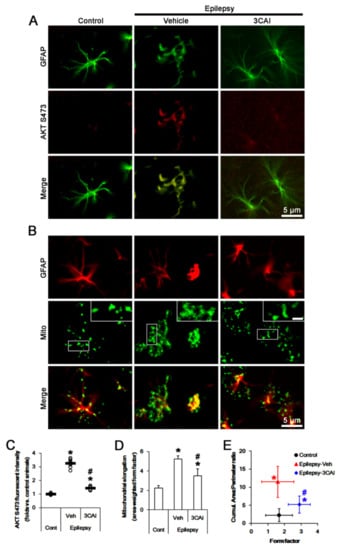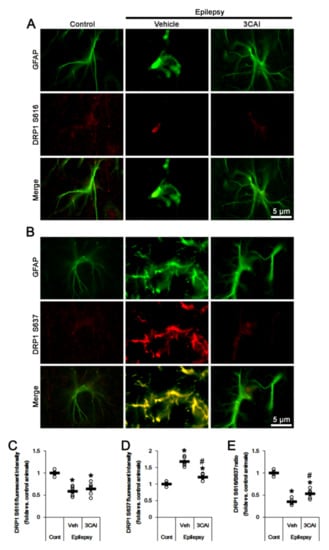 2.5. 3CAI Decreases AKT S473 and DRP1 S637 Phosphorylations in CA1 Astrocytes