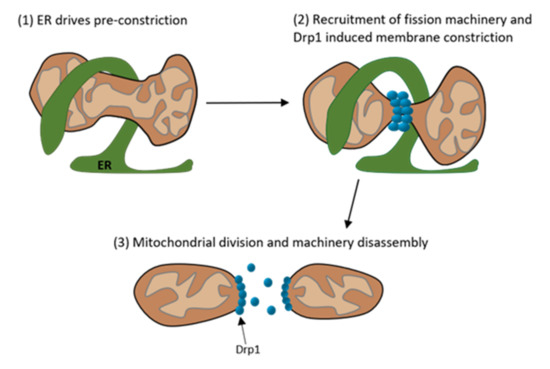 Schematic depiction of the multistep process of mitochondrial division. (1) The Endoplasmatic Reticulum (ER) is present at the mitochondrial division site and preconstricts the mitochondrion. (2) At the preconstricted mitochondria site forms the division complex with its main component Drp1, which further constricts the mitochondrion. (3) After the constriction the mitochondrion divides into two mitochondria and the division machinery disassembles. (Modified according to Tilokani et al. [40]).