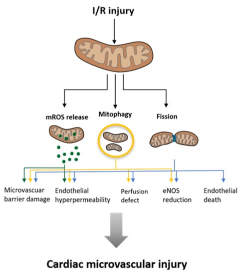 Influence of Ischemia and Reperfusion (I/R) injury on mitochondria and the consequences for the surrounding cardiac microvascular tissues. (Modified according to Wang et al. [88]).