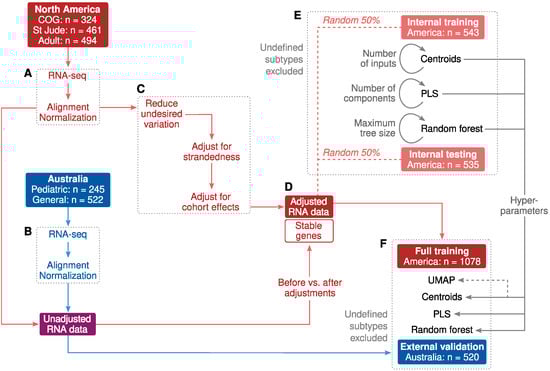 Study design. (A,B) RNA-seq pre-processing was applied separately for North American and Australian datasets. (C) Non-biological differences due to technical artifacts and cohort effects were adjusted according to genetically matched subsets (details in Methods). (D) Correlation coefficients were calculated between unadjusted and adjusted expression levels to exclude genes that were heavily influenced by confounders. A total of 6673 stable genes with R ≥ 0.9 were included for subtype modeling. (E) Internal training and testing sets were randomly chosen from the North American participants as initial material to evaluate machine learning models and to determine hyperparameters. The randomization was conducted separately for each subtype to ensure matching subtype frequencies, which explains the small difference in set sizes. (F) Final machine learning models were trained with the full North American dataset and validated in the Australian dataset.