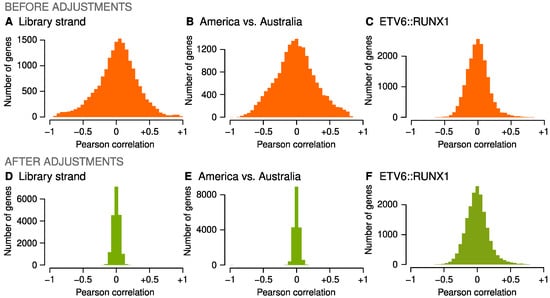 Impact of confounder adjustments. Pearson correlation coefficients were calculated between 18,503 log-transformed genes, and a technical or clinical variable before and after gene expression levels were adjusted as described in Methods. A wide histogram indicates substantial covariation across the transcriptome, while a narrow histogram indicates successful removal of covariance. (A,D) The North American cohorts included 204 (16%) RNA samples that were sequenced with an unstranded library. (B,E) Strandedness and other technical differences manifested as substantial covariation between the transcriptome and the continent of origin. (C,F) Covariation between gene expression and ALL subtypes, such as ETV6::RUNX1, was preserved.
