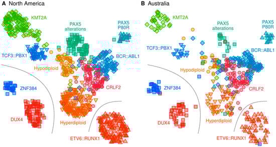 To verify that the data processing was technically sound, we constructed a visual layout of the individuals according to the North American data (Figure 3A) and then projected the unadjusted American and Australian datasets onto the layout using the same statistical model (Figure 3B). The use of unadjusted data is important here since it provides a more realistic picture of how new, previously unseen samples would behave in a diagnostic pipeline. Clusters of the most frequent ALL subtypes were observable, and there was a high degree of concordance between the training and validation cohorts. A visualization of all subtypes and undefined samples is available in Supplement Figure S6. For convenience, we organized the subtypes into a central supergroup (CRLF2, hyperdiploid, hypodiploid, PAX5 alterations and BCR::ABL1) and distinct subtypes on the periphery (DUX4, ETV6::RUNX1, KMT2A, PAX5 P80R, TCF3::PBX1 and ZNF384).