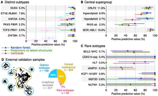 We chose a random forest approach [] as an example of a supervised non-linear machine learning technique that can predict multi-class outcomes from complex input data. We also created Projections to Latent Structures (PLS) for each ALL subtype separately as an example of a linear factorization method []. Separate PLS models were fitted to each subtype versus other samples. The third type of modeling was based on neighbor distances: we calculated mean RNA profiles (centroids) for every ALL subtype and classified individuals based on the nearest centroid in the data space. Unsupervised clustering was achieved with the Uniform Manifold Approximation and Projection (UMAP) algorithm [] to gain qualitative visual insight into the RNA-based segregation of ALL subtypes.