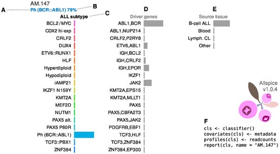 Example of a report card from the Allspice classifier for an adult male patient from North America with Philadelphia (BCR::ABL1) genetic B-cell ALL subtype. (A) Sample identifier and predicted subtype based on RNA data in top-left corner. (B) The report shows the frequency of the corresponding genetic subtype in the training data, given the observed gene expression profile. In this case, there was a 79% chance that sequence and cytogenetics analyses would confirm the presence of the Philadelphia chromosome. (C) Visualization of how similar the sample is to each ALL subtype profile. The display can be interpreted as a panel of RNA “biomarkers” that are specific to each subtype. In this case, the high value for Ph indicates that the gene expression profile is compatible with a typical patient with the Philadelphia chromosome. (D) Allspice also indicates how similar the sample is to the RNA profiles associated with the presence of genetic alterations in one or more genes in parallel. In this case, the gene expression profile matches the typical profile of patients with independently verified BCR::ABL1 fusion (i.e., both BCR and ABL1 are altered). (E) Samples with high leukemia burden will typically produce a strong B-cell ALL signal in the tissue panel. (F) Minimal example of how to generate the report in the R programming environment.