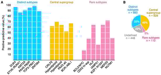 The second rationale for the streamlined ALL taxonomy was to ensure a rigorous study design for machine learning. Previous studies have classified patients according to the way their RNA-seq expression profiles cluster (examples include the Ph-like and ETV6::RUNX1-like subtypes [,]). However, these definitions are problematic for the training of RNA profiling classifiers—the same gene expression levels should not be used to first define and then predict a subtype. Instead, we relied on observable sequence abnormalities or other information that was not derived from gene expression levels (except for DUX4). As a trade-off, the size of the training set decreased, and the number of individuals with undefined genomic subtypes increased; however, such uncertainty is to be expected in real-world datasets that manifest substantial biological variation in how genomic lesions drive altered gene expression profiles.