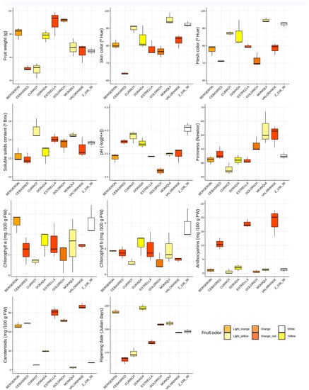 Phenological and fruit quality traits boxplots (fruit weight, skin color, flesh color, soluble solids content, acidity (pH), firmness, chlorophyll a, chlorophyll b, anthocyanins, carotenoids and ripening date) evaluation of the nine cultivars assayed, ‘Bergeron’, ‘Cebasred’, ‘Currot’, ‘Dorada’, ‘Estrella’, ‘Goldrich’, ‘Moniquí’, ‘Valorange’ and ‘Z 108-38′ at physiological ripening. Boxplots are filled with the fruit color of each cultivar.