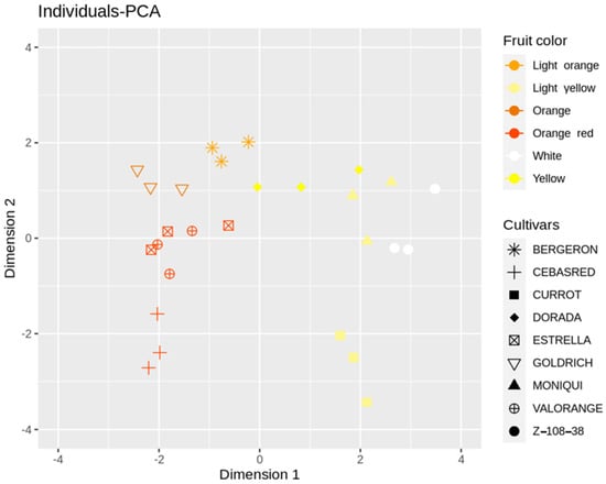 Individuals-PCA plot (Figure 3) showed cultivar distribution samples concerning the main PCA dimensions 1 and 2. The cultivars analyzed displayed a wide range of skin color, flesh color and carotenoids content from the white fruit and lower carotenoids content ‘Z 108-38′ to the orange–red and enriched in carotenoids content ‘Valorange’, distributed in a gradient according to its skin color, flesh color and carotenoids content along dimension 1, from orange–red and orange enriched in carotenoids cultivars in the left to white/light yellow and lower levels of carotenoids cultivars in the right. Besides, ripening date trait showed a high contribution to PCA dimension 2, displaying a gradient from the early ripening date ‘Cebasred’, at the bottom left side; to the late-ripening date ‘Dorada’, located at the top right.