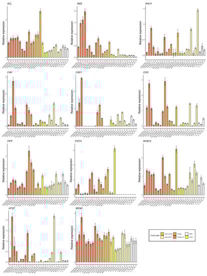 Most of the genes involved in anthocyanins biosynthesis (Figure 5) were found up-regulated in orange–red, orange and yellow fruit color cultivars, whose expression increases during the ripening process, reaching the maximum expression at physiological ripening in most cases. ‘Cebasred’, an ‘Orange Red’ cultivars mainly covered by an intense red blush was the cultivar with the highest expression of genes ANS, C4H, UFGT and WD40, increasing the expression the ripening process. The gene CHS showed its maximum expression in the orange–red and orange cultivars ‘Cebasred’ and ‘Goldrich’. The orange cultivar ‘Bergeron’ showed the highest expression of the transcription factor MYB10 and the gene 4CL. The gene F3′5′H, responsible for anthocyanin hydroxylation, was highly up-regulated in the yellow fruit cultivar ‘Dorada’, less expressed in the other orange–red or orange cultivars, and completely silenced in the light yellow and white ones. On the other hand, the transcription factor bHLH appeared up-regulated in light yellow cultivars such as ‘Currot’ and ‘Moniquí’. We found the maximum gene expression of UFGT in the contrasted fruit color cultivars ‘Currot’ and ‘Cebasred’.