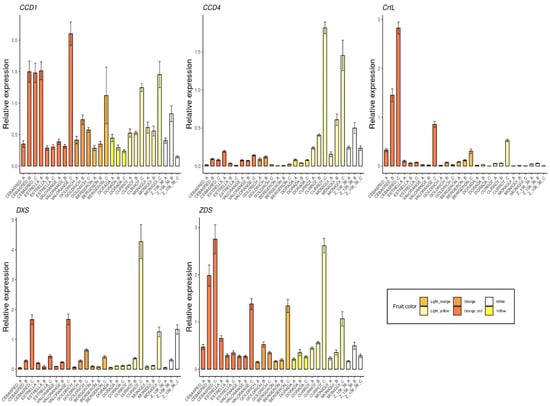 Furthermore, candidate genes involved in carotenoids biosynthesis and degradation (Figure 6) were monitored. The gene DXS, a precursor of carotenoids compounds, showed increased expression during the ripening process, reaching its maximum at physiological ripening. The highest expression of DXS at physiological ripening was detected in the cultivar ‘Currot’, followed by ‘Cebasred’ and ‘Valorange’. As expected, the genes ZDS and CrtL, involved in carotenoids biosynthesis were found up-regulated in orange–red cultivars, increasing their expression during the ripening process. Besides, the light yellow cultivar ‘Currot’ showed an overexpression in the gene ZDS. The genes responsible for carotenoids degradation were included in the analysis due to their importance for carotenoids metabolism. In this case, CCD4 was highly up-regulated in the light yellow cultivars ‘Currot’ and ‘Moniquí’. No clear pattern was identified in the gene expression of CCD1.