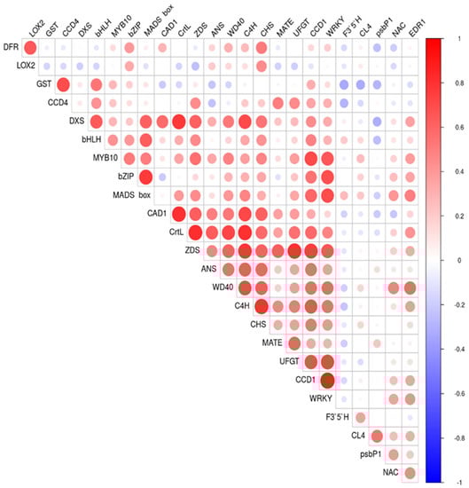 Pearson correlation plot for the relative gene expression evaluated by using RT-qPCR of genes involved in anthocyanins and carotenoids biosynthesis and ripening process progression in the nine cultivars ‘Bergeron’, ‘Cebasred’, ‘Currot’, ‘Dorada’, ‘Estrella’, ‘Goldrich’, ‘Moniquí’, ‘Valorange’ and ‘Z108-38′ at three ripening stages green fruit, during color change and at physiological ripening. The assayed genes included DFR, LOX2, GST, CCD4, DXS, bHLH, MYB10, bZIP, MADS-box, CAD1, CrtL, ZDS, ANS, WD40, C4H, CHS, MATE, UFGT, CCD1, WRKY, F3′5′H, CL4, psbP1, NAC and EDR1.