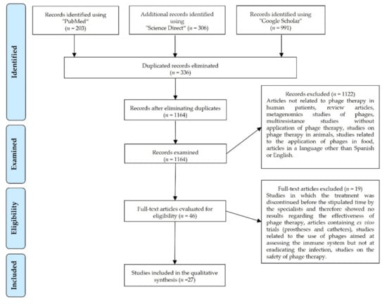 The review also excluded bibliographic material that had not been reviewed by academic peers; articles written in a language other than Spanish or English; articles published outside the selected duration; bibliographic material, such as reviews, systematic reviews, posters, conferences, book sections, and perspectives; multidrug-resistance-based studies that did not use phage therapy; studies on metagenomics in bacteriophages without subsequent application in human patients; studies on PT in animals; and studies on the use of phages in foods.