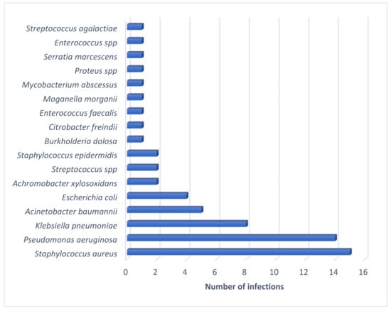 A total of 61 multidrug-resistant bacterial species were reported, including Staphylococcus aureus (24.5%, n = 15/61), Pseudomonas aeruginosa (22.9%, n = 14/61), Klebsiella pneumoniae (13.1%, n = 8/61), and Acinetobacter baumannii (8.1%, n = 5/61) (Figure 2).