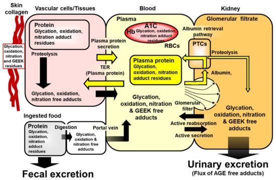 Schematic multicompartment representation of the formation, physiological processing and transit of protein glycation, oxidation, nitration and GEEK adducts in mammalian metabolism. Abbreviations: A1C, glycated hemoglobin HbA1c; PTC, proximal tubular epithelial cell; TER, transcapillary escape rate. Modified from a similar scheme for glycation adducts in []. Adapted with permission from Ref. []. Copyright year 2021, Elsevier.