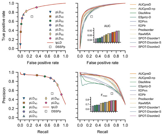 Receiver operating characteristic (ROC) curves (top) and precision–recall (bottom) are depicted for various predictors calculated per residue on the DisProt-PDB dataset. Note that a ROC curve captures the probability of true and false positives at all thresholds, where an ideal predictor will have an area under the curve (AUC) equal to 1. Further note that a precision–recall curve captures the trade-off between precision and recall; again, in the ideal case the harmonic mean of the precision and recall (F) will be equal to 1; bar colors correspond to the legend, red denotes tpLD. In all cases the tpLD (Equation (1)) and various discrete pLD predictors are indicated alongside DSSPp. The tpLD predictor resulted in one of the highest AUC values and the highest F on the DisProt-PDB dataset. pLDDT is abbreviated as pLD for plotting purposes.