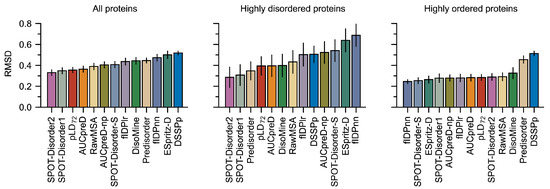 Average RMSD (Equation (2)) values calculated for the DisProt-PDB datasets using various prediction methods calculated per protein. Proteins were assigned to classes (highly disordered i.e., >90% disorder and highly ordered i.e., <10% disorder) based on datasets. Bootstrapping—that is, sampling with replacement—was used to compute averages and estimate errors with 10,000 samples of size 60. pLD resulted in lower RMSD values on the DisProt-PDB dataset compared to DSSPp. pLDDT is abbreviated as pLD for plotting purposes.