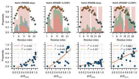 We used ColabFold [45] to generate both Neh4 and Neh5 structures, our model IDP systems. Two approaches were used: the first was to consider the peptide sequences used in our previous work [46,47], specifically 111SDALYFDDCMQLLAQTFPFVDDN133 and 180MQQDIEQVWEELLSIPELQCLNIENDKLVE209. These are the Neh4 and Neh5 domains, respectively. The second approach was to consider the more realistic construct that includes the linker 106AHIPKSDALYFDDCMQLLAQTFPFVDDNEVSSATFQSLVPDIPGHIESPVFIATNQAQSPETSVAQVAPVDLDGMQQDIEQVWEELLSIPELQCLNIENDKLVETTMVP214 and extract the local structures comprising the domains. ColabFold generates five ranked structures per sequence giving rise to three pools of structures. Alignment of the structures within the Neh4 and Neh5 pools showed excellent agreement and we opted to simply consider the top-ranked structures in each pool, denoted Neh4 (P) and Neh5 (P). Alignment of these peptide structures to the longer construct suggests good agreement; however, there were some constructs with structural differences. We consider the construct that was the most heterogeneous with respect to the smaller peptides and extracted the local Neh4 and Neh5 structures, denoted Neh4 (C) and Neh5 (C).