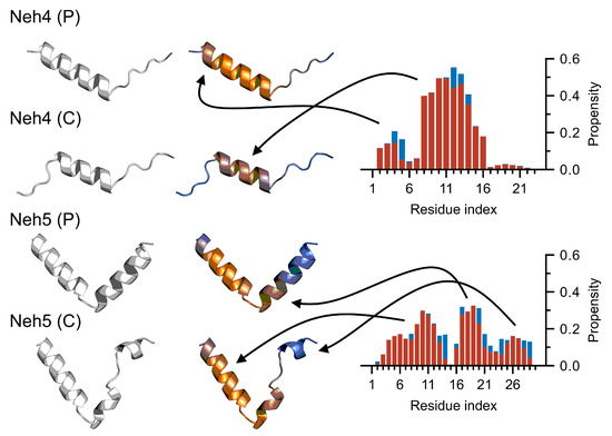 Nrf2 (nuclear factor erythroid 2-related factor 2) is a partially disordered transcription factor [47,57] and is the master regulator of the cellular anti-oxidative response. Within the multi-domain Nrf2 protein, two transactivation domains, namely Neh4 and Neh5, are responsible for binding the transcriptional adaptor zinc-binding domains, TAZ1 and TAZ2, of CBP; references [58,59]; previous work has elucidated the free-state ensembles of Neh4 and Neh5 using both MD simulations and circular dichroism [46]. We consider the AF2 predicted structures of the Neh4 and Neh5 peptides (Neh4 (P) and Neh5 (P)) and the structures predicted for Neh4/5 within a larger construct (Neh4 (C) and Neh5 (C)). Comparison of the secondary structures determined from the AF2 predictions and simulated ensembles suggested relatively good agreement; regions of low helical propensity in the ensemble corresponded to lower helical propensity in the AF2 structures, and the converse was also true (Figure 5). There also appeared to be some agreement between pLDDT and secondary structure; however, these correlations were weak (Figure 5) and depended strongly on the system considered (Neh4 vs. Neh5). We also overlaid the pLDDT with the predicted structures seeking to assess the potential for additional insights. Immediately evident was the heterogeneity in the predicted structures when considering the peptide and the larger construct. Notably, the differences in the structure occurred precisely where the pLDDT was lower (e.g., the N-terminal of the Neh4 (P) that was not present in the Neh4 (C) and the C-terminal helix in Neh5 (P) that was split in Neh 5 (C)). The pLDDT and heterogeneity of the structures in particular with Neh5, agreed closely with the observed secondary structure from the ensembles (Figure 5 and Figure 6); specifically, the triple helix, with a hard break at I14-P15 and a transient break from N22–E24. These structural dynamics—that is the exchange between a large and a small helix in the C-termini of Neh5—appeared to be captured explicitly by the pLDDT and implicitly by the heterogeneity of the AF2 structures.