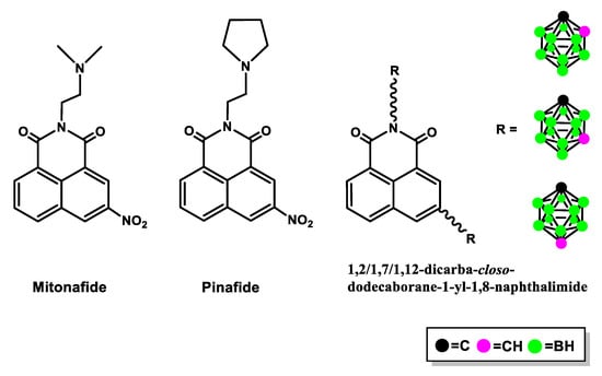 Most of the chemicals were obtained from the Acros Organics (Geel, Belgium) and were used without further purification unless otherwise stated. 4-Bromo-1,8-naphthalic anhydride (1) was obtained from the TCI (Tokyo, Japan) and used without further purification. Boron clusters were purchased from KATCHEM spol. S.r.o. (Řež/Prague, Czech Republic). All experiments that involved water-sensitive compounds were conducted under rigorously anhydrous conditions and under an argon atmosphere. Flash column chromatography was performed on silica gel 60 (230–400 mesh, Sigma-Aldrich, Steinheim, Germany). Rf refers to analytical TLC performed using pre-coated silica gel 60 F254 plates purchased from Sigma-Aldrich (Steinheim, Germany) and developed in the solvent system indicated. Compounds were visualized using UV light (254 nm) or a 0.5% acidic solution of PdCl2 in HCl/methanol by heating with a heat gun for boron-containing derivatives. The yields are not optimized.