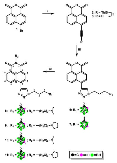 3.1.3. Synthesis of 1,8-Naphthalic Anhydride Derivatives 6 and 7 and 1,8-Naphthalimide Derivatives 8 and 11 Modified with Carborane Cluster via “Click Reaction”