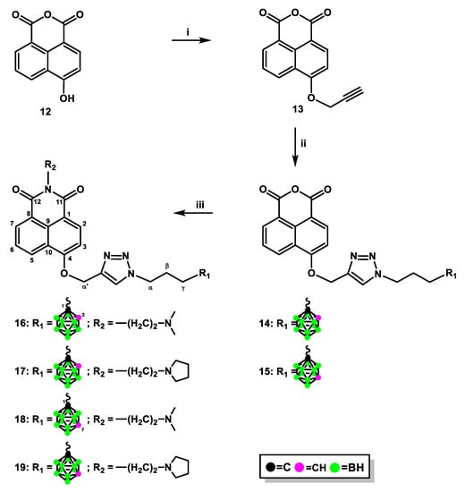 1-(3-Azidopropyl)-ortho-carborane (4) or 1-(3-azidopropyl)-meta-carborane (5) (1 equiv.) was dissolved in THF/H2O (2.4;1, v/v, 2.6 mL per 0.1 mmol). 4-(Prop-2-yn-1-yloxy)-1,8-naphthalic anhydride (13) (1 equiv.), copper (II) sulfate pentahydrate (0.05 equiv.) and sodium ascorbate (0.1 equiv.) were added. The reaction mixture was stirred under dry argon for 24 h at 40 °C. The reaction was quenched by evaporation of the solvents. The crude compound was purified by column chromatography on silica gel (230–400 mesh) with CHCl3 (100%) as an eluent to afford the product.