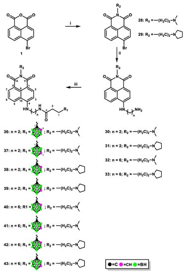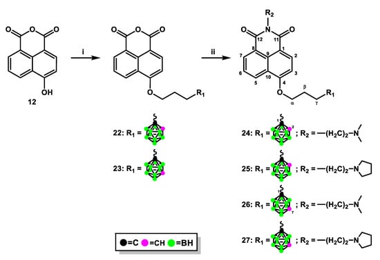 4-[3-(1,2-Dicarba-closo-dodecaborane-1-yl)propoxy]-1,8-naphthalic anhydride (22) or 4-{14-[3-(1,7-dicarba-closo-dodecaborane-1-yl)propoxy]-1,8-naphthalic anhydride (23) was suspended in absolute EtOH (7–8 mL per 0.1 mmol) and N,N-dimethylethylenediamine (1.7 equiv.) or N-(2-aminoethyl)pyrrolidine (1.7 equiv.) was added. The reaction mixture was stirred for 4 h at 45 °C under an inert (Ar) atmosphere. Subsequently, the solvent was evaporated to dryness under vacuum, and the crude product was purified by column chromatography on silica gel (230–400 mesh) with a gradient of MeOH (0–10%) in CHCl3.
