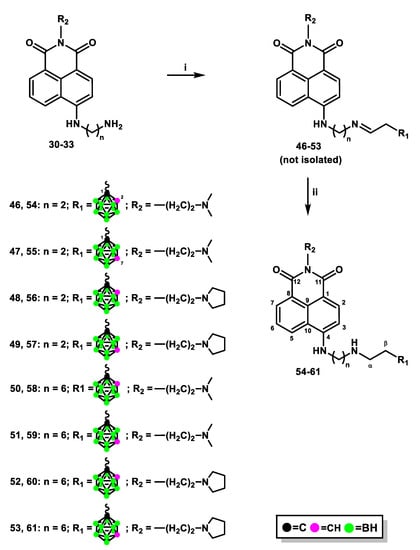 N-[2-(Dimethylamino)ethyl]-4-[(2-aminoethyl)amino]-1,8-naphthalimide (30), N-[2-(N-pyrrolidinyl)ethyl]-4-[(2-aminoethyl)amino]-1,8-naphthalimide (31), N-[2-(dimethylamino)ethyl]-4-[(6-aminohexyl)amino]-1,8-naphthalimide (32) or N-[2-(N-pyrrolidinyl)ethyl]-4-[(6-aminohexyl)amino]-1,8-naphthalimide (33) (1 equiv.) was dissolved in dry THF, dry AcOEt (for synthesis of compound 55) or dry MeOH (for synthesis of compounds 57, 59, and 61) (2.4 mL per 0.1 mmol) and 2-(1,2-dicarba-closo-dodecaborane-1-yl)ethanal (44) or 2-(1,7-dicarba-closo-dodecaborane-1-yl)ethanal (45) (1.2 equiv.) was added. The reaction mixture was stirred for 24 h at reflux under an inert (Ar) atmosphere. Next, to the Schiff base, 46–53 NaBH3CN (3 equiv.) was added, and the reaction mixture was stirred for 24 h at RT under an inert (Ar) atmosphere. Subsequently, the solvent was evaporated to dryness under vacuum, and the crude product was purified by column chromatography on silica gel (230–400 mesh) with a gradient using MeOH (5–20%) in CH2Cl2. Additionally, the purified product was dissolved in MeOH/CH2Cl2 (1:39, v/v) and washed with the same volume of NaHCO3 (2.5%) and three times with water. The organic phase was separated, dried over MgSO4, filtered, and evaporated to dryness. Then, the product was purified again by column chromatography using the same condition as described above.