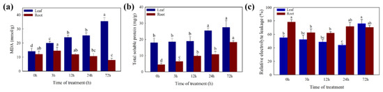 Figure 3. Measurement of (a) MDA, (b) soluble protein, and (c) electrolyte leakage levels. Different letters (a–d) in the figures indicate significant differences at p < 0.05 level among different time points in the same tissue.