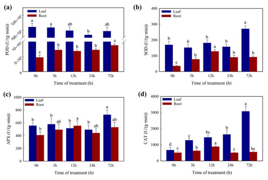 In addition, the content of SOD and APX (Figure 4) showed a significant increase after 72 h Cd treatment and no significant difference during the first 24 h in leaves. The CAT content (Figure 4) was increased significantly in the first 3 h and after 72 h Cd treatment in leaves. There was no significant difference in POD (Figure 4) during the 72 h Cd treatment in leaves. In roots, the content of SOD and CAT was increased significantly in the first 12 h, the POD was significantly increased in the first 3 h and the APX showed no significant difference.
