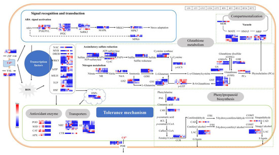 The strategy of plants under heavy metal stress is determined by many aspects, such as heavy metal concentration, species, rhizosphere environment, and related metabolite level [11]. There are different sensitivities to heavy metal exposure were existed among different plant species. Till now, the response mechanism of various herbaceous species to Cd stress has been widely studied, such as Galega orientalis [12], Solanum nigrum (S. nigrum) [10], Brassica rapa [13], Festuca elata [14], and Hibiscus cannabinus [15]. However, the response mechanism of Cd has not been revealed in all the above species. In general, there are two strategies to resist Cd exposure [16,17]. One strategy is the avoidance mechanism, which tries to reduce Cd migration and avoid heavy metals entering roots [18]. Mycorrhiza and root exudates in the rhizosphere play a significant role to avoid heavy metal stress [19]. The other strategy relies on confinement and detoxification of heavy metals, which is the tolerance mechanism [16]. It reduces Cd toxicity mainly with chelation and antioxidant systems [20,21]. Glutathione (GSH) can combine Cd ions with the extending function of phytochelatins (PCs) synthesis, and the PCs-Cd complex is transported into vacuoles for detoxification, which is an efficient defense strategy in non-hyperaccumulator plants [22]. Reactive oxygen species (ROS) will produce under Cd stress, which can cause severe damage to plants. Malondialdehyde (MDA) is an important index of phytotoxicity [23], which indicated the toxicity level of plants [24]. To mitigate oxidative damage to plants, the enzymatic and non-enzymatic antioxidant systems are employed [25]. The most important enzymes include catalase (CAT), peroxidase (POD), superoxide dismutase (SOD) and glutathione reductase (GR) [25], and ascorbic acid (ASA), GSH is a non-enzyme and reduced GSH the main non-enzymatic antioxidant can be oxidized to glutathione disulfide (GSSG) to scavenge ROS [22,26]. Furthermore, the transporter family also has an important role under Cd stress, such as heavy metal ATPase (HMA), ATP-binding cassette (ABC), natural resistance-associated macrophage protein (Nramp), and cation diffusion facilitator (CDF) [27,28].