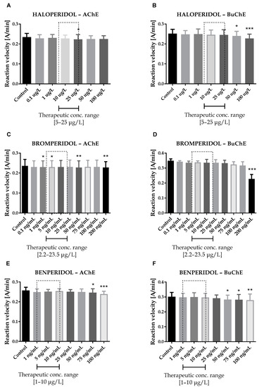 Effects of haloperidol (A,B), bromperidol (C,D) and benperidol (E,F) on AChE and BuChE in vitro activity, respectively. Each data point represents mean ± standard deviation (SD) for at least three independent experiments conducted in duplicates. * p < 0.05, ** p < 0.01, *** p < 0.001 vs. control.