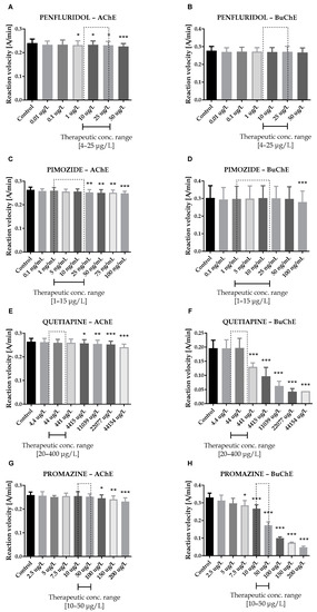 Seven antipsychotic drugs, including derivatives of butyrophenone (haloperidol, bromperidol and benperidol), phenothiazine (promazine), diphenylbutylpiperidine (pimozide and penfluridol) and thiazepine (quetiapine), were thoroughly examined in vitro towards the inhibition of human acetyl- and butyrylcholinesterase. Donepezil and rivastigmine, agents which reversibly inactivate ChEs, were used as reference compounds. Donepezil inhibited 50% of AChE and BuChE activity at concentrations of 0.025 ± 0.004 µmol/L and 12.81 ± 1.52 µmol/L, respectively. The corresponding values for rivastigmine were as follows: 64.29 ± 2.97 µmol/L and 0.95 ± 0.09 µmol/L. Effects of antipsychotic drugs on AChE and BuChE reaction velocity are presented in Figure 1A–F and Figure 2A–H.