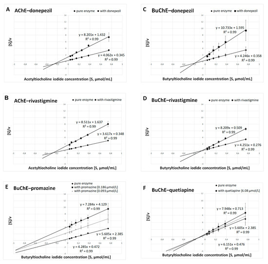 Determination of kinetic parameters of enzymatic reactions. The Hanes–Woolf plots were used to calculate the maximal velocity (Vmax) and the Michaelis–Menten constant (Km). (A) AChE and donepezil at a concentration of 0.025 μmol/L. (B) AChE and rivastigmine at a concentration of 64.29 μmol/L. (C) BuChE and donepezil at a concentration of 12.81 μmol/L. (D) BuChE and rivastigmine at a concentration of 0.95 μmol/L. (E) BuChE and promazine at a concentration of IC50 = 0.186 μmol/L and ½ IC50 = 0.093 μmol/L. (F) BuChE and quetiapine at a concentration of IC50 = 6.08 μmol/L and ½ IC50 = 3.04 μmol/L. Results are presented as mean ± SD for two or three independent experiments, conducted in duplicates on various erythrocytes for AChE and plasma for BuChE.