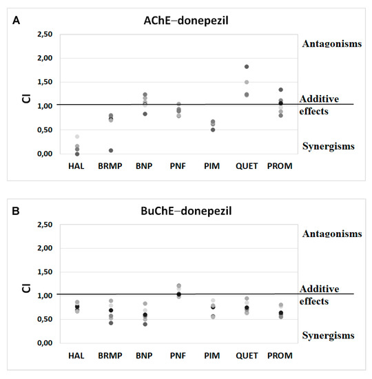 Analysis of potential synergism between donepezil (DON) and haloperidol (HAL), bromperidol (BRMP), benperidol (BNP), penfluridol (PNF), pimozide (PIM), quetiapine (QUET) and promazine (PROM) with the application of the median–effect principle. Data from an AChE (A) and BuChE (B) inhibitory activities assay were analyzed with the Chou–Talalay method. Results are presented as CI values determined with ComboSyn software for binary mixtures with variable concentration of donepezil (range 0.005–0.1 µmol/L for AChE and 2–100 for BuChE) and constant concentration of antipsychotic (at their TPCmax). The darker marker means higher concentration of DON in binary mix. The IC values for an individual concentration of DON are shown in Table S1 (Supplementary Materials). CI—combination index: where CI < 1, =1 and >1 indicate synergism, additive effect and antagonism, respectively.