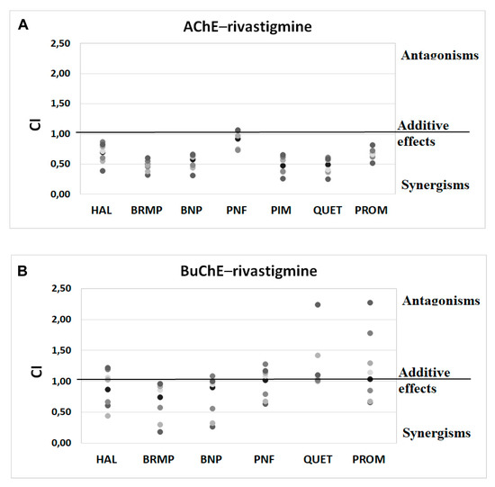 Analysis of potential synergism between rivastigmine (RIV) and haloperidol (HAL), bromperidol (BRMP), benperidol (BNP), penfluridol (PNF), pimozide (PIM), quetiapine (QUET) and promazine (PROM) with the application of the median–effect principle. Data from an AChE (A) and BuChE (B) inhibitory activities assay were analyzed with the Chou–Talalay method. Results are presented as CI values determined with ComboSyn software for binary mixtures with variable concentration of rivastigmine (range 5–100 µmol/L for AChE and 0.05–5 for BuChE) and constant concentration of antipsychotic (at their TPCmax). The darker marker means higher concentration of RIV in binary mix. The IC values for an individual concentration of RIV are shown in Table S2 (Supplementary Materials). CI—combination index: where CI < 1, =1 and >1 indicate synergism, additive effect and antagonism, respectively. Figure 5B does not show a relationship between the interaction of rivastigmine/pimozide on BuChE, which ComboSyn calculated to be above 2.5, beyond the scale of the plot.