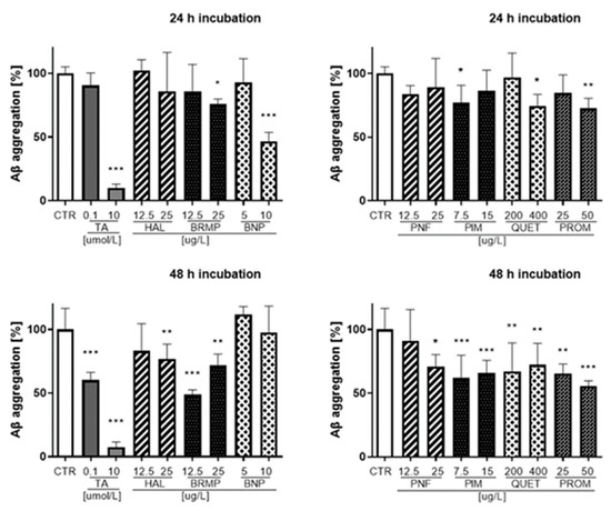 The effects of antipsychotics on the aggregation of Aβ were examined using fluorescent properties of Thioflavin T (ThT) dye. Fluorescence measurements were performed for antipsychotics at the TPC and ½ × TPC. The obtained results, presented as a percentage of Aβ aggregation, are included in Supplementary Materials for 10, 30, 60 and 90 min incubation (Figures S1 and S2, Supplementary Materials), whereas those for 24 and 48 h are shown in Figure 6.