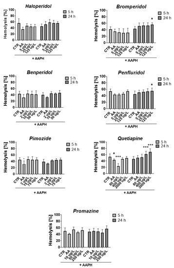 After 5 h, all compounds slightly reduced or did not contribute to the lysis of RBCs, except for quetiapine at a concentration of 80 μg/L, which produced a statistically significant decrease in RBCs hemolysis compared with the control with AAPH (23.9% vs. 53.4% for AAPH control, p < 0.001). The opposite effect was produced after 24 h of incubation, in which enhanced hemolysis was observed (51.9% vs. 45.9% for AAPH control, p > 0.05). It may indicate a dependence of the hemolytic effect on the time of exposure to quetiapine since, in the case of all tested concentrations of quetiapine, an increase in the hemolytic effect was reported over time between 5 and 24 h. Similar dependence was reported for bromperidol, for which hemolysis increased over time for all tested concentrations.