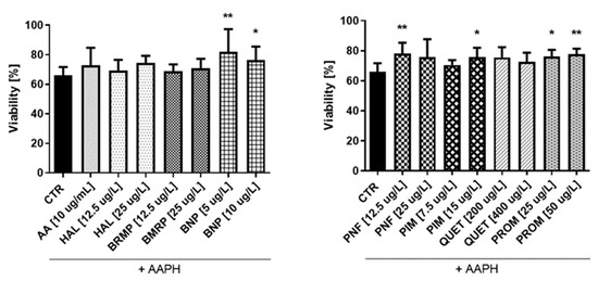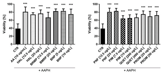 In the case of astrocytes (Figure 9), it was also found that some tested compounds protect cells against oxidative stress at a level comparable to AA (10 μg/mL), for which viability was 72.9%. Only four substances—benperidol (5 and 10 μg/L), penfluridol (12.5 μg/L), pimozide (15 μg/L) and promazine (25 and 50 μg/L)—showed a statistically significant increase in the astrocyte viability compared with the control, where cells treated with pure AAPH were used. The greatest impact (81.9%) was revealed in the case of benperidol at a concentration of 5 μg/L, whereas the lowest one (68.9%) was revealed in the case of bromperidol at a concentration of 12.5 μg/L.