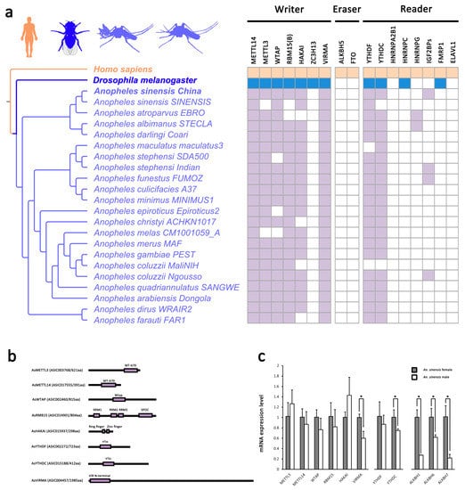 The toolkit of mRNA m6A modification in An. sinensis and Anopheles spp. (a) The distribution of mRNA m6A components in Anopheles spp. (b) Domain-structure of m6A writer and readers in An. sinensis. (c) The gene expression level of mRNA m6A components in female and male An. sinensis (*: p < 0.05).