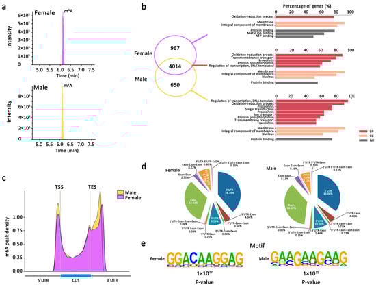 Overview of m6A methylome in female and male An. sinensis. (a) mRNA m6A in female and male An. sinensis detected by mass spectrometry. (b) Numbers of sex-specific and common m6A peaks genes and GO enrichment. (c) Accumulation of m6A-IP reads along transcripts. Each transcript was divided into three parts: 5′UTRs, CDS and 3′UTRs. (d) The distribution of m6A peaks within different gene contexts. (e) Sequence motifs with the most m6A peaks.