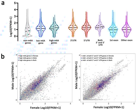 The expression levels of genes with m6A modification were significantly higher than that of genes without m6A modification in both female and male An. sinensis (Kruskal–Wallis test, p < 0.001) (Figure 3a,b). Moreover, the expression of m6A modified genes at UTR regions had higher levels than those at exon regions or without m6A modification, respectively (Kruskal–Wallis test, p < 0.001) (Figure 3a,b).