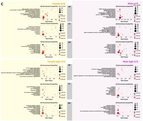Expression level of mRNA and analysis. The read counts per gene were then normalized to obtain FPKM values (total exon fragments /mapped reads (millions) × exon length (kB)) using StringTie [74]. Differentially expressed genes and differences in abundance of m6A peaks between male and female mosquitoes were calculated as fold change (FC), with absolute log2 FC ≥ 1 and p < 0.05 by R package edgeR [75]. Gene ontology (GO) and KEGG enrichment were carried out with online tools of LC-BIO company (https://www.omicstudio.cn/index, accessed on 22 October 2021).