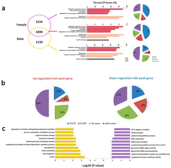 Differential m6A peaks in female and male An. sinensis. (a) The distribution of genes with differentially m6A peaks at different positions between female and male An. sinensis (male vs. female). (b) The distribution of up and down regulated m6A peak genes. (c) GO-enrichment analysis of genes with up-(left) and down-(right) regulated m6A peaks.