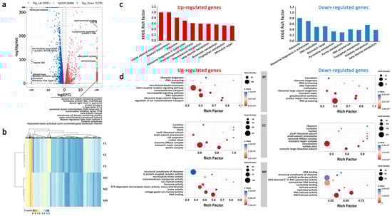 A total of 3369 differentially expressed genes were identified between male and female An. sinensis, and 2091 genes were up-regulated, and 1278 were down-regulated, respectively (male vs. female) (Figure 5a,b). Among them, some sex-specific genes were identified, such as Heme peroxidase, Envelysin, Yippee-like, microtubule-associated protein, RP/EB family, Abhydrolase domain-containing protein, and Niemann-Pick Type C-2 were only actively expressed in female mosquitoes, while adenylate cyclase, leucine-rich repeat-containing protein, serine kinase, homeobox protein Nkx, invertebrate, dynein light chain 1, were specifically identified in male mosquitoes (Figure 5a). Up-regulated differentially expressed genes were dominated in the pathways of Indole alkaloid biosynthesis, betalain biosynthesis, ribosome and ribosome biogenesis in eukaryotes, while down-regulated differentially expressed genes were in the ribosome, ribosome biogenesis, and histidine metabolism (Figure 5c). In addition, up-regulated expressed genes were highly enriched in biological processes of rRNA procession, microtubule-based movement, neuropeptide signaling pathway, ribosomal large subunit biogenesis, and regulation of ion transmembrane transport; in cellular components of the ribosome, cilium, cell projection, motile cilium; and in molecular functions of transmembrane transporter activity and ion channel activity, respectively (Figure 5d). The down-regulated expressed genes were highly enriched in biological processes of DNA replication, methylation, pseudouridine synthesis, and protein import into the nucleus; in cellular components of small ribosomal subunit, small-subunit processome, exosome (RNase complex), mismatch repair complex, and nuclear pore; and in molecular function of nucleotide-binding (Figure 5d).