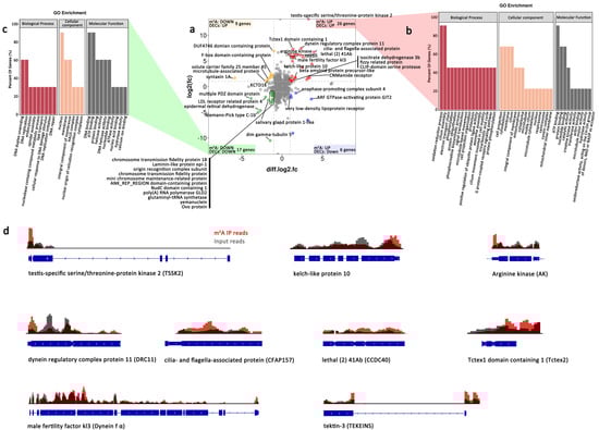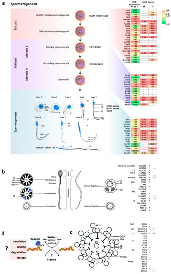 The 54 differentially expressed genes with different m6A peaks were carefully annotated with corresponding information from model organisms (human, D. melanogaster, and C. elegans). Interestingly, it was noticed that 14 up-regulated genes involved in spermatogenesis, especially in the development of sperm flagellum, were potentially regulated by m6A modification on mRNA (Figure 6a,d).