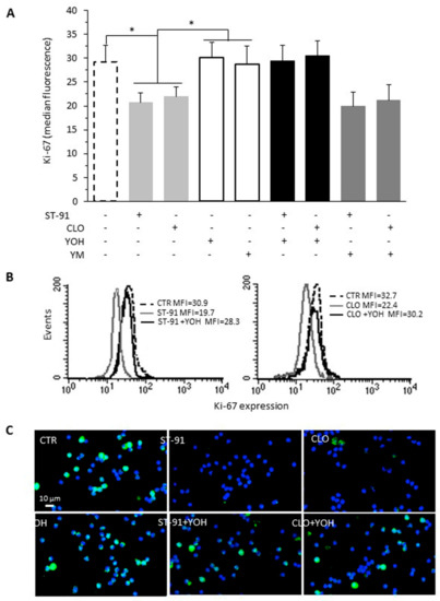 Effect of α2-AR agonists on B16F10 cell proliferation. Cell proliferation was evaluated by flow cytometry measuring Ki-67 nuclear antigen expression in B16F10 cells, untreated (CTR) or treated with clonidine (CLO, 1 μM) or ST-91 (1 μM) alone or in combination with the α2-AR antagonist yohimbine (YOH, 1 μM) or with a Gq protein inhibitor YM-254890 (YM) for 48 h (left panel). (A) Bar graph showing the results obtained from five different experiments and expressed as mean ± SD. On the ordinate y-axis, the median fluorescence intensity values are reported. * p < 0.05. (B) Cytofluorimetric curves showing one representative experiment out of five. Numbers represent the median fluorescence intensity. (C) Representative micrographs of B16F10 cells, treated as indicated, after dual staining with an FITC-conjugated antibody against Ki-67 (green) and with Hoechst (blue).