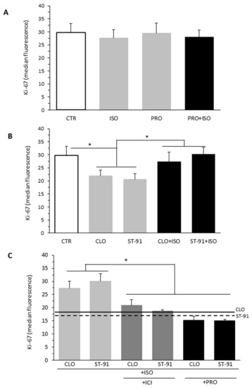 To assess the relative role of each β-AR subtype in modulating the antiproliferative action of the α2-AR agonists, B16F10 cells were treated for 48 h with the following AR ligands: isoproterenol (ISO), ST-91, clonidine (CLO), propranolol (PRO), ICI 118,551 (ICI), isoproterenol plus propranolol (PRO), clonidine plus isoproterenol, or ST-91 plus isoproterenol (Figure 3). We found that isoproterenol alone had no effects on B16F10 cell proliferation, as assessed by Ki-67 staining (MFI 27.58 ± 3.27), compared to control (MFI 29.7 ± 3.45, p > 0.05).