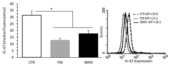 Effect of cAMP levels on B16F10 cell proliferation. (Left panel) Flow cytometry analysis of cell proliferation after staining with Ki-67 nuclear antigen of B16F10 cells untreated or treated with FSK, a direct adenylyl cyclase activator, or IBMX, a non-selective phosphodiesterase inhibitor. Data from three independent experiments are reported. (Right panel) On the ordinate y-axis, the median fluorescence intensity values are reported. Results from one representative experiment out of three are shown, * p < 0.05.