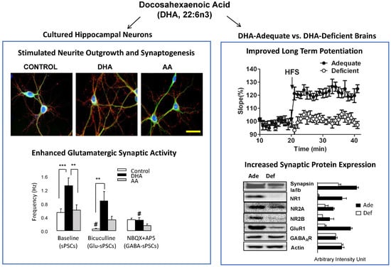 Docosahexaenoic acid (DHA, 22:6n-3), the omega-3 polyunsaturated fatty acid that is highly enriched in the brain, is required for optimal neurodevelopment and function []. The maximum accumulation of DHA in the brain occurs late in pregnancy and the early postnatal period when brain growth, neurogenesis, and synaptogenesis are most active []. The important role of DHA in these vital developmental events is evident as DHA stimulates neurite growth and arborization, synapsin puncta formation, synaptic protein expression, and glutamatergic synaptic activity in primary embryonic hippocampal neuron cultures [,], while it improves the long-term potentiation (LTP), a cellular model of learning and memory, and increases the expression of synaptic proteins involved in neurotransmission in the mouse brain (Figure 1). DHA also promotes the differentiation of rat embryonic neural stem cells and stimulates hippocampal neurogenesis in the adult rats []. Furthermore, DHA enrichment in the brain results in an anti-apoptotic effect, promoting neuronal survival under adverse conditions []. These effects of DHA may contribute to the enhanced functional recovery following traumatic brain injury in mice after dietary omega-3 fatty acid supplementation [,] and the prevention of cognitive deficits in the offspring of maternal DHA-deficient mice by omega-3 fatty acid supplementation in the early perinatal period [].