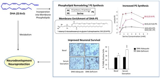 Neurodevelopmental and neuroprotective actions resulting from the membrane incorporation and metabolism of DHA. DHA increases PS in the neuronal membrane as DHA-containing phospholipids are the best substrate for PS biosynthetic activity. Susceptibility to neuronal cell death is reduced by increasing the PS level. Certain metabolites of free DHA can also exert neuroprotective effects. DHA, docosahexaenoic acid; PC, phosphatidylcholine; PE, phosphatidylethanolamine; PS, phsphatidylserine. Adapted from references [,].