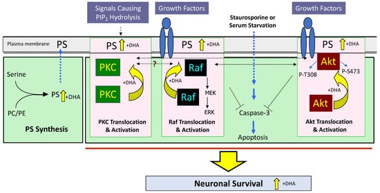 A time-dependent increase in apoptotic cell death due to serum starvation is prevented when Neuro 2A cells are enriched with DHA []. This is associated with an increase in DHA incorporation into PS and the total PS content of the cells. The antiapoptotic effect does not occur when the cells are grown in a serine-free medium or enriched with oleic acid, indicating the DHA and PS dependence of this effect. The mechanism of this neuroprotective effect involves the membrane translocation of key kinases that is required for their activation. In response to growth factors or G-protein signaling, the Raf-1, Akt, or PKC is translocated to the membrane and this process is facilitated by increasing the membrane PS by DHA supplementation [,,], as illustrated schematically in Figure 3. For example, increasing the plasma membrane PS in Neuro 2A cells facilitates the IGF-induced Akt activation, and decreasing the PS content using CHO mutant cells lacking PS synthase-1 exerts the opposite effects []. PS is also essential for the plasma membrane recruitment of 3-phosphoinositide-dependent kinase 1 (PDK1), one of the major upstream enzymes for Akt phosphorylation []. Through facilitating Akt signaling, DHA-enhanced PS enrichment in the plasma membrane plays a salvaging role in neuronal survival when cells are under adverse conditions [,].